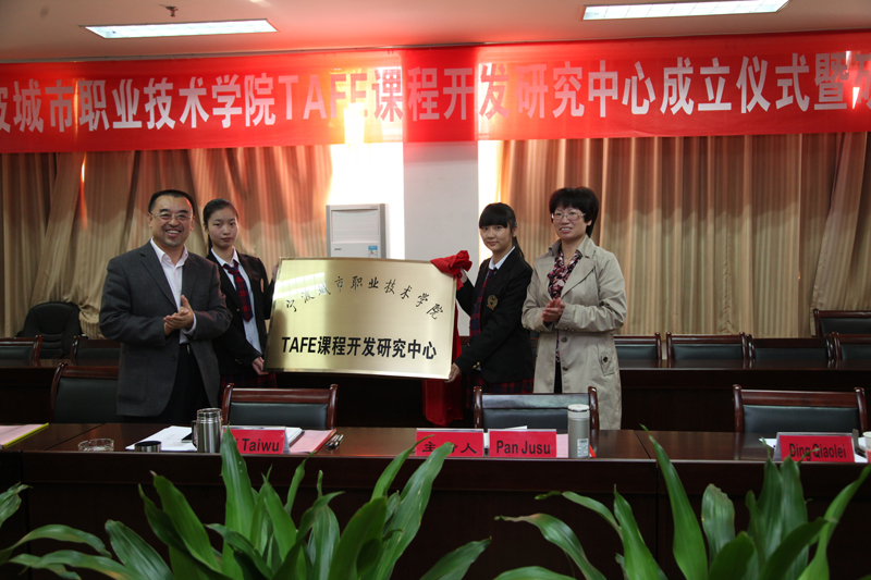 会上,李太武院长首先对TAFE课程开发研究中心的成立表示热烈祝贺。强调要加大学校的国际化课程体系建设的步伐,提出应进一步深入解读剖析TAFE课程包,要做到“洋为中用、澳为我用”,在本土化实施经验积累的基础上,基于本国和本校实情进行开发和改良。要求在学校与澳大利亚TAFE学院已有合作专业的基础上做大做强,做出特色。接着,他对中心的工作提出了不定期进行研讨、开展讲座、将研究与专业和课程等建设相结合、以及将成果分期应用等要求。随后,李太武院长为研究中心授牌。