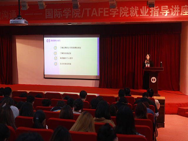 2020年11月14日上午,国际学院/TAFE学院第五期“职涯讲堂”之《面试技巧与高效沟通》在红色报告厅举行。本次讲座邀请到多元化集团人力资源经理张作玲,为学院2021届毕业生及部分在校生进行就业专题指导。