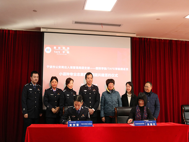 为进一步弘扬“奉献、友爱、互助、进步”的志愿精神,动员大学生积极参与志愿服务,12月15日下午14时,星空官方入口国际学院/TAFE学院团总支与宁波市公安局出入境管理局团支部签署《小语种专业志愿服务团团共建机制协议》(以下简称《协议》)。宁波市公安局出入境管理局代表、鄞州公安分局出入境管理大队负责人、国际学院/TAFE学院领导、小语种中心教师、“国际义工”学生代表等130余人参加并见证签约仪式。国际学院/TAFE学院院长丁俏蕾主持仪式。