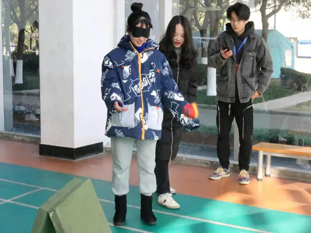 活动中同学们在蒙眼前进的过程中模拟了特殊事件的发生,沉着应对、冷静思考,加上同伴的正确指引,方能化险为夷。