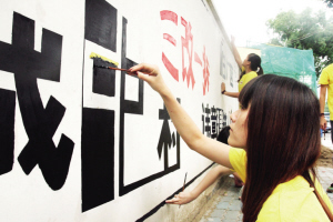 城市职院学生志愿者进行“三改一拆”墙绘绘制。