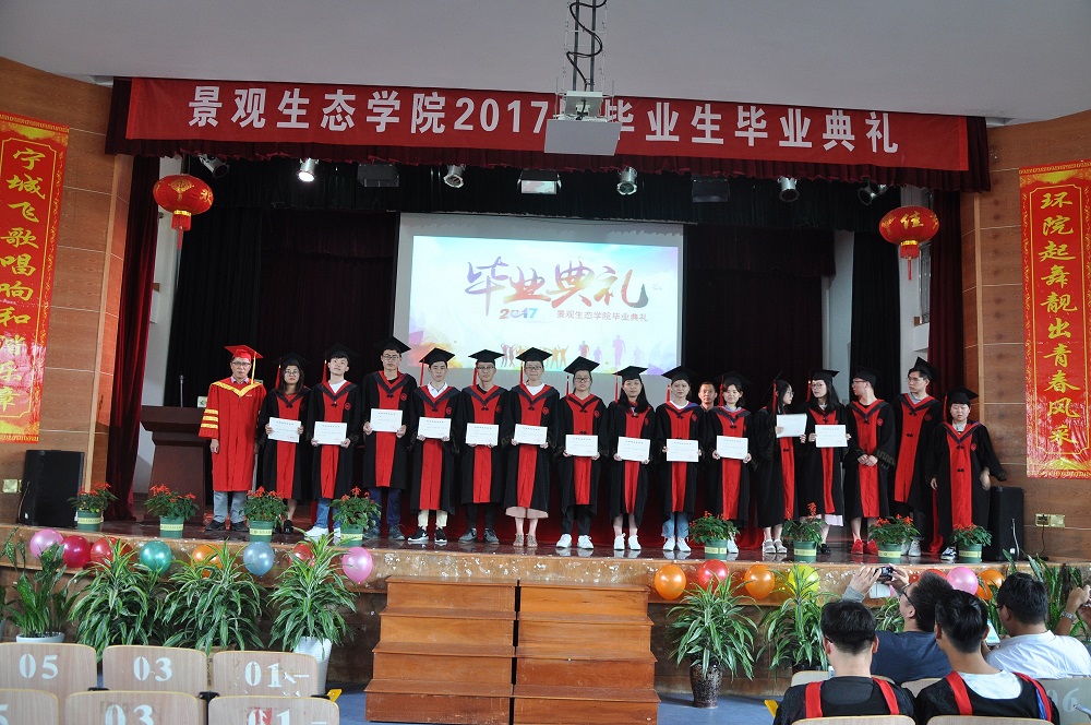 在毕业典礼上,校党委书记周国明老师为优秀毕业生颁发荣誉证书。景观生态学院院长吴立威老师代表学院对440名毕业生顺利毕业表示祝贺。他引用马云的名言“改变自己,才能改变未来”勉励全体毕业生。教师代表杨嘉玲老师也对毕业生希望同学们在人生路上去学习,去适应,并勇敢接受事业的挑战。国家级优秀奖学金获得者屈能杰代表毕业生向全体教师致答谢词。每个毕业班级为了表达对班主任的感激之情,向班主任老师献上了鲜花。