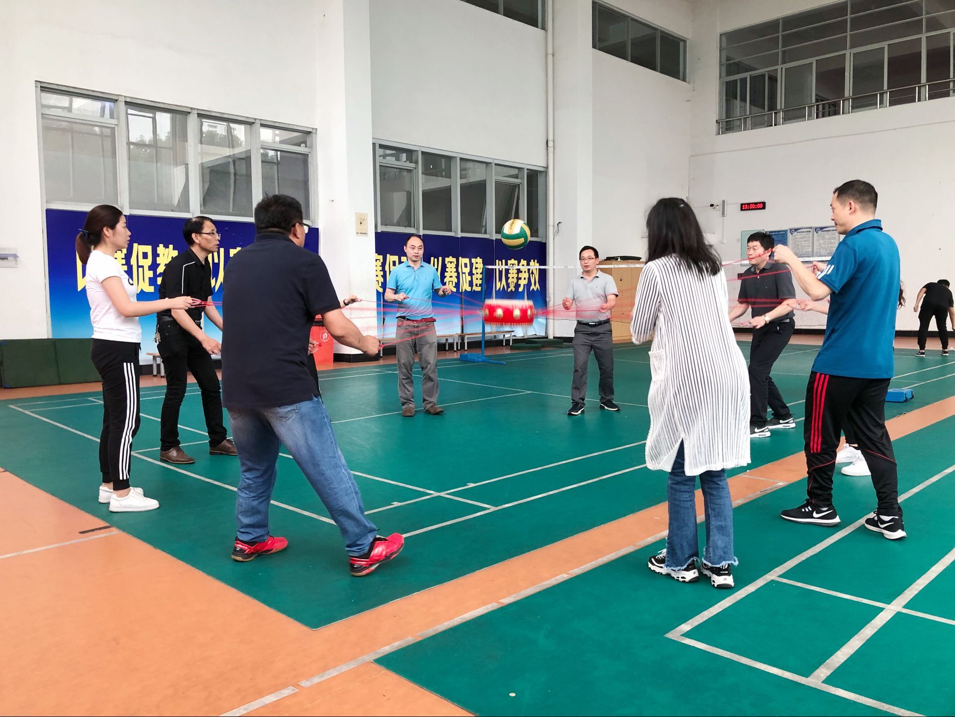 室外的阴雨不能阻止教工们参与的热情。本次活动在学校篮球馆和羽毛球馆举行。共设置了5个比赛项目,分别有:师生拔河、集体跳绳、动感颠球、两人三足(亲子项目)、双人背夹气球(亲子项目)。每一个比赛项目不但是智慧和体力的角逐,还是团结和协作的完美展示。