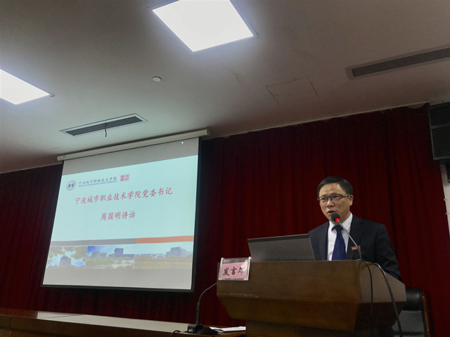 接着校党委书记周国明用“特殊、挑战、应对、成就”四个关键词给新生们上了生动一课。他认为,我们生活在特殊的时代,社会扩招生是一个生源结构特殊、身份特殊、学习诉求特殊的群体。这个班级的教学及管理工作对于教师和学生来说都是很大挑战。学生要接受挑战,尽快适应大学生活。而学校、学院将应对很多从未遇见过的教学和管理问题,进行不断地工作创新。因此我们期望值不要过高,要做好教学相长。他用四句话“学生是学生、学生也是老师、老师是老师、老师也是学生”来告知在场师生,明白自己是谁。要成就自己,成就学院,成就不一样的精神;更要秉承“尚德明责笃学强能”的校训,实现梦想,成就伟大中国梦。