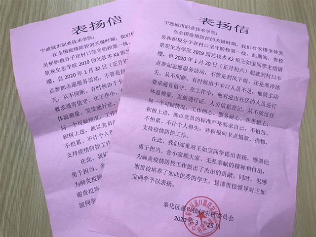 表扬信上说,我校景观生态学院2019园艺技术K3班学生党员竺岳波、王如宝同学主动请缨参加奉化区溪口镇任宋村卡口点的志愿服务。他们以党员的标准严格要求自己,主动要求通宵值守,不计得失,并积极向卡点捐款、捐物,支持疫情防控工作。任宋村委员会以表扬信的形式感谢这两位学生党员在抗击疫情的关键时期,支持村委打赢疫情防控攻坚战中的无私奉献精神。同时,也向我校培养出如此优秀的学生表示感谢!
