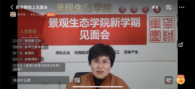 新年伊始,春意盎然。2月21日景观生态学院班子成员和学院1400余名同学在云端见面,为全体同学上了一堂精彩纷呈的开学第一课,送上新学期寄语,见面会由党总支副书记张军侠主持,辅导员班主任共参与。