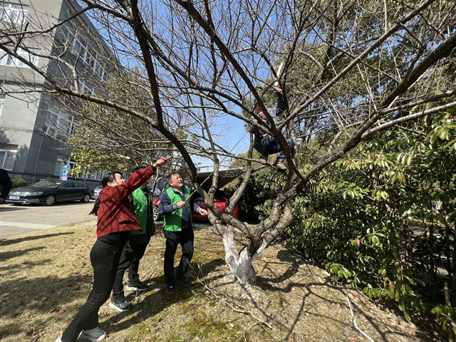 党员们携带修枝剪等工具,来到校园梅花林,充分发挥专业优势,和工人们一起投入到梅树修剪中。“师傅,您看这个枝子很长了,芽点也很密,现在正好是开花后修剪的好时机,我们要把长枝条剪了。还有病虫枝和重叠枝也要剪了,可以节省养分,也可以提高通风,透光性。”园林专业刘夔老师一边认真给工人们讲解修剪知识,一边手把手教修剪技能。