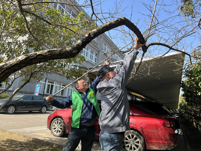 党员们携带修枝剪等工具,来到校园梅花林,充分发挥专业优势,和工人们一起投入到梅树修剪中。“师傅,您看这个枝子很长了,芽点也很密,现在正好是开花后修剪的好时机,我们要把长枝条剪了。还有病虫枝和重叠枝也要剪了,可以节省养分,也可以提高通风,透光性。”园林专业刘夔老师一边认真给工人们讲解修剪知识,一边手把手教修剪技能。