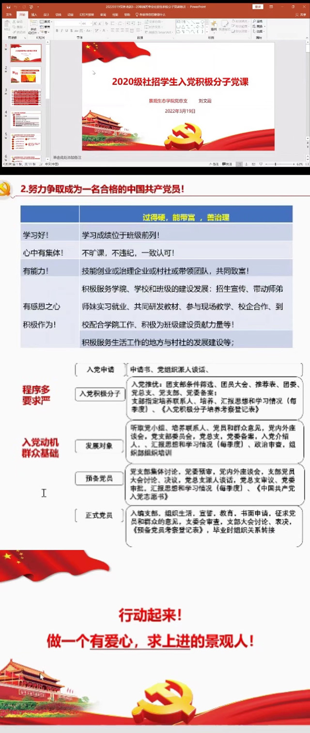 “培育更多过得硬、能带富、善治理的领头雁。严把党员发展入口关。”周末傍晚,随着刘文霞书记为2020级园艺专业社招班入党积极分子在钉钉直播上的党课开讲,景观学院党总支在理论中心组领学的基础上,向全体入党积极分子原原本本地学习传达宁波市第十四次党代会精神。