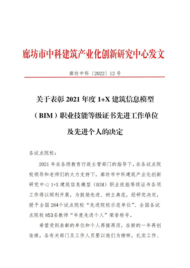 近日,由国家职业教育培训评价组织—廊坊市中科建筑产业化创新研究中心举办的2021年工作总结会议召开。会议公布并表彰了1+X建筑信息模型(BIM)职业技能等级证书2021年度优秀院校,其中,我校在建筑工程技术和建筑装饰工程技术两大专业持续几年职业技能培训取得丰硕成果的基础上,被授予2021年度1+X建筑信息模型(BIM)职业技能等级证书先进工作单位。