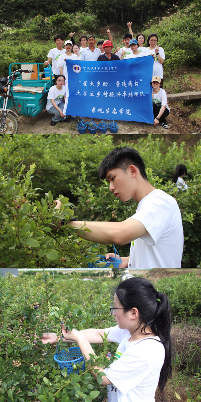 仲夏时节,蓝莓飘香。6月28日,在象山新桥上盘村来了一群大学生,耐着酷暑高温、冒着似火骄阳,忙着采摘、分拣成熟的蓝莓果,与村民们一起享受着丰收的喜悦,他们就是景观生态学院“星火乡助”乡村振兴卓越团队的同学们,也是学践悟小分队的积极分子。由于近期雨水增多、天气突变,而正值上盘村蓝莓基地的丰收时刻,同学们无惧高温日晒,投入到村民的抢收蓝莓队伍中去,助力乡村振兴。