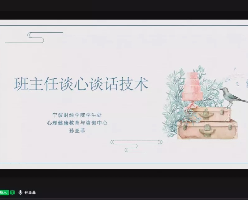 为进一步加强学院班主任队伍建设,强化育人效果,帮助班主任及时掌握学生思想及心理动态,提升谈心谈话工作能力,10月12日晚,景观生态学院召开全体班主任会议暨线上班主任心理育人专题培训,特邀请宁波财经学院心理中心主任、国家二级心理咨询师、专职心理健康教育教师孙亚菲老师,为全体班主任就如何进行学生谈心谈话工作做专题培训。
