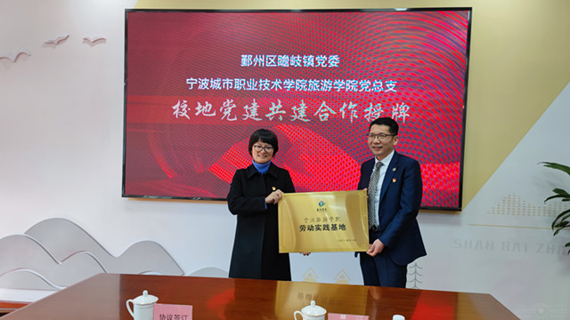 党总支书记朱建国代表旅游学院党总支,瞻岐镇党委副书记吕辉代表瞻岐镇党委签署了校地党建共建合作协议。并在瞻岐镇挂牌建立“宁波旅游学院大学生劳动实践基地”和“宁波旅游学院党建工作实践基地”。
