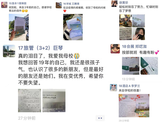 近日,旅游学院2021届、2019届的校友们收到了来自“旅柚邮局”寄出的“惊喜”——毕业那年“写给未来自己”的一封信,随信而来的还有学院深切的关心问候。感动之余,校友们纷纷在朋友圈晒出或怀念或勉励的收信感言。