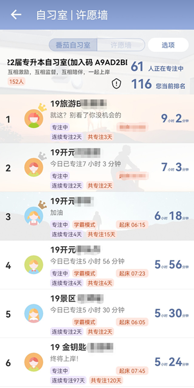 第三,通过“云督学”提升学生学习效率。班主任和负责辅导员也加入到云自习室中来,关注学生的专注时长及早起状况,对于表现良好的学生进行奖励,对于表现不佳的学生有针对性地开展谈心谈话,加强监督管理。实现对学生的学习情况的及时了解和有效监督。