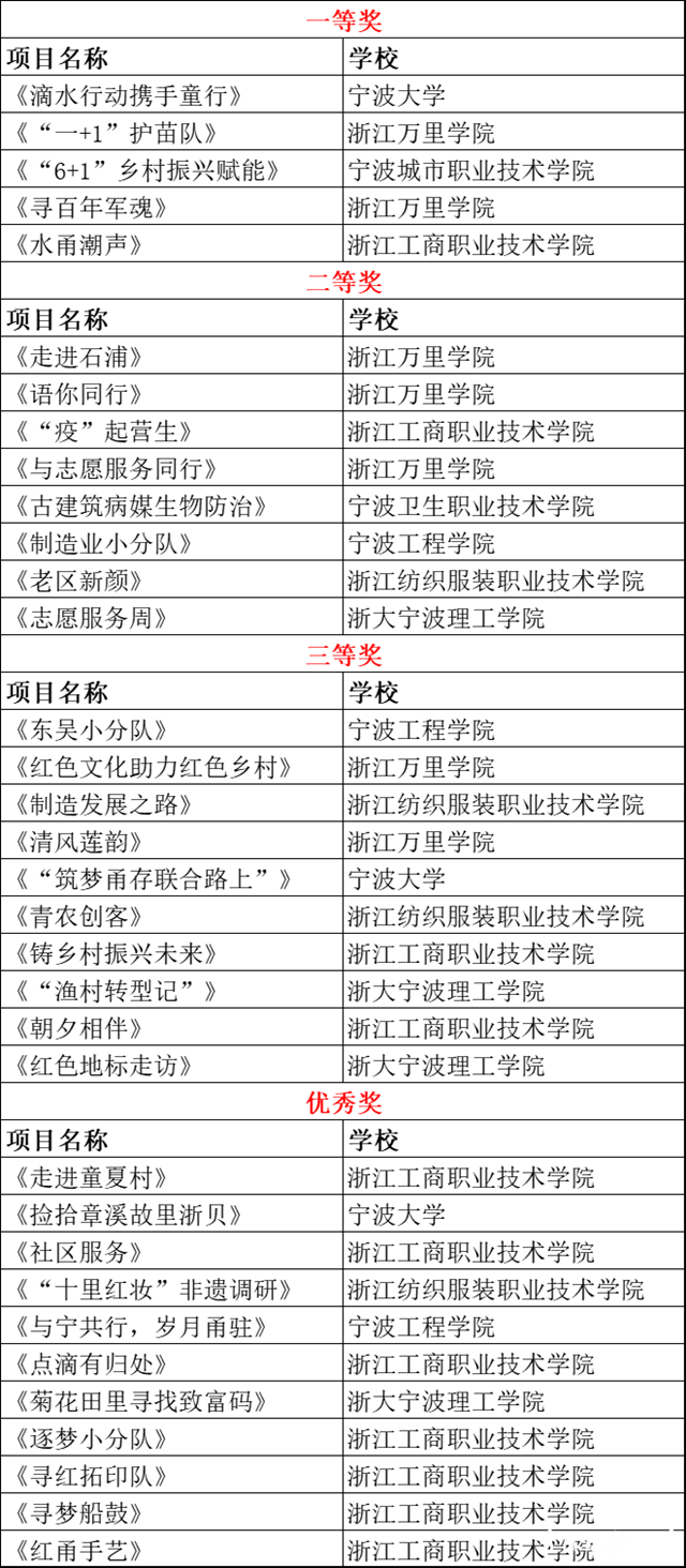据悉,2022“我和宁波这座城”大学生社会实践挑战活动由中共宁波市委宣传部、宁波日报报业集团、宁波市教育局联合组织,活动从2022年6月开始,历时半年,在甬高校近百支团队参与其中。经初评及决赛定评,本次赛项共评出一等奖5组,二等奖8组,三等奖10组,优秀奖11组。