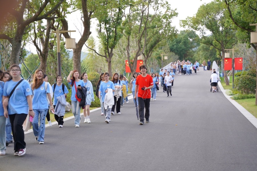 第二环节,“行走钱湖”。23级新生在班主任和班助的带领下,从院士中心出发,徒步拉练赴小普陀景区圆融广场。强身健体、增进班级凝聚力的同时,沿途欣赏钱湖古村落和绝美湖景,偶遇诸多特色茶馆、咖啡馆,钱湖泛舟、水上餐厅等独特业态,感受风土人情,近距离体验旅游行业。