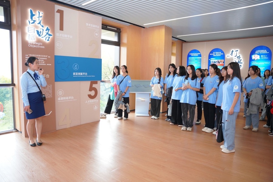 第一站,走“近”院士中心。10月11日中午,556名23级新生分两批出发,在学长学姐们的现场沿途讲解中感受这个“第二故乡”的城市脉动。学术楼聆听院士故事、感悟院士“好学、思辨、担当、坚守”的探索精神,提升德育修养;院士长廊欣赏建筑艺术,登顶观景台俯瞰钱湖古村,提升美学修养;院士林中参与除草松土劳动教育,培养劳动兴趣,提高实践能力;体验茶咖新业态、打卡记录网红景点,培养专业兴趣,提高专业“智”力。“院士中心让我看到国家的富强、民族的振兴离不开老一辈院士们的辛勤付出”,23研学A班宋珂莹同学表示,“我们作为新时代青年,一定会传承院士精神,志存高远,担当有为,用青春书写时代答卷。”