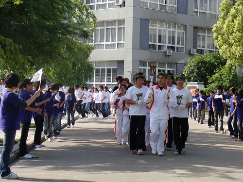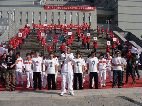 当火炬手和10名护跑手缓缓跑进校园时,我院300多名学生夹道欢迎,一路掌声和欢呼;当火炬队伍行进到阳光广场前,《北京欢迎你》的音乐响彻校园,100名同学在艺术大楼台阶上排出100字样的人形队伍,以体现在亚特兰大举行的百年奥运,同时,广场上拉起了“one world,one dream 同一个世界,同一个梦想”的横幅,用我们城院人的热情欢迎火炬走进城院。