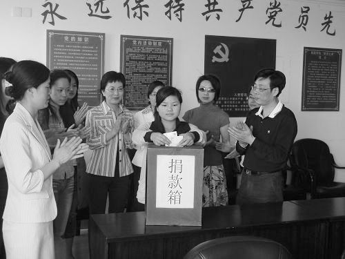 5月16日中午12点,学院在报告厅摆出了为四川汶川献爱心的捐款箱,组织全院教职工捐款。不到半小时,报告厅已聚集了上百名教师,他们自觉的排着长长的队伍等待捐款。