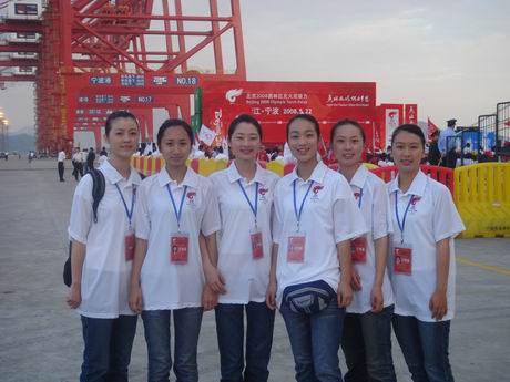 ,这就是宁波城市学院礼仪队,作为北京奥运圣火传递浙江宁波站的礼仪志愿者,承着中华儿女的百年梦想,带着灾区人民的信念与希望,服务于北京奥运圣火在宁波站的传递,这是我院礼仪队完成的一次特别光荣而神圣的任务。张颖芬等六名同学经宁波市体育局和宁波团市委领导精心严格的培训和一丝不苟的彩排,出色地完成了在宁波港四期码头举行的“火炬起跑仪式”和杭州湾大桥宁波和嘉兴火炬传递交接仪式上的礼仪接待工作,并获得了一致赞誉和好评。
