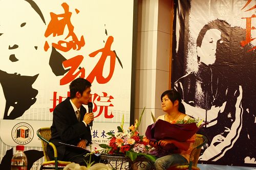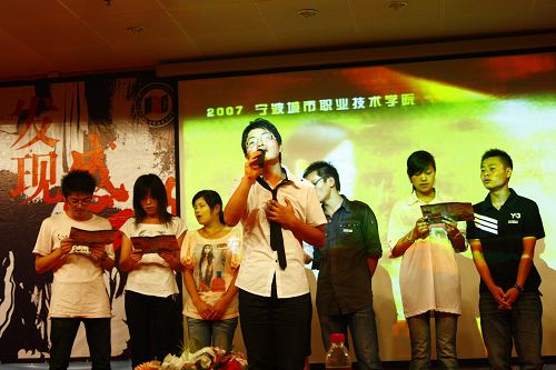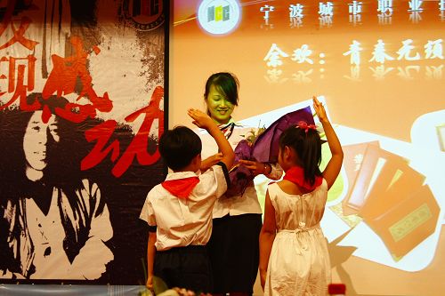 “你用年轻抒写的真诚/你用木球传承的精神/你用微笑绽放的青春/我们有同样的感受/同样期待的眼神……”当07旅游会展班金焱唱起了他特地为晚会创作的主题曲《感动城院》时,全场一次又一次响起了经久不息的掌声。“‘大手牵小手’”青年志愿者、尹卫琴、陈金松……当主持人报出这一个个镌刻着动人故事的名字时,现场的气氛更是达到了高潮。