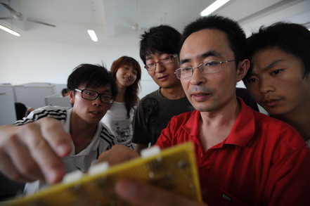 6月30日,星空官方入口建立以来规模最大的一次学生实训双周课正式开课。全院6000多名学生将在今后两周时间里,到校内的数十个实训室和社会上的实训基地接受技能培训。图为信息学院教师潘世华(右二)正在给楼宇智能化工程技术专业的学生讲解电路板制作要领。(本报通讯员 严 龙 刘 玲 摄)