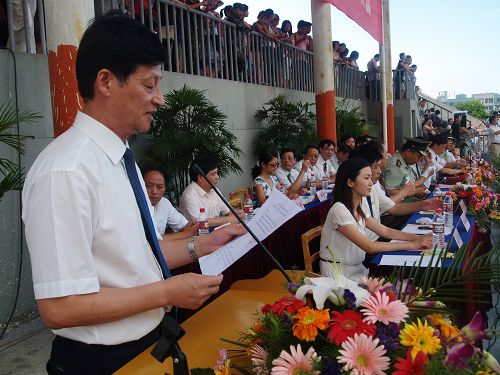 全体校领导、公安海警高专朱林海大校、军训团团长张明耀上校等领导以及我校2007级学生军训领导小组全体成员、全体教官、各学院辅导员、班主任、全体2007级参训学生出席了大会。会议由党委副书记周国明主持。