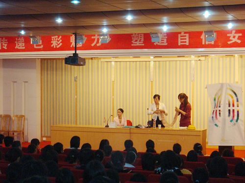 两位老师从女性生活礼仪着手,穿插丝巾的系法、四季色彩图讲解、服饰搭配等内容,通过理论知识分析、学员互动练习、现场演练等方式的具体讲解,讲授了“如何运用丝巾的不同系法来展现自己的魅力”。周老师还为在场的师生分析了不同季节类型女性适合的颜色和服饰,大家兴趣浓厚,意犹未尽。