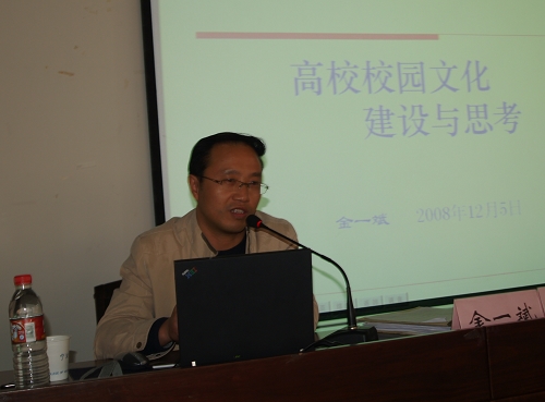 “文化是轻灵的,但你可以用呼吸来感受它。文化是厚重的,你却只能用时间称量它。”第二场讲座由金一斌副书记主讲,他分析了先进文化对高校的要求;高校校园文化建设面临的挑战;社会、企业、报纸、高校等各类文化的魅力;还具体讲解了高校校园文化建设案例。