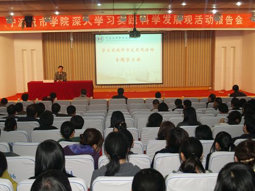 3月25日下午,学院学习实践科学发展观专题学习会在艺术楼报告厅举行。会议学习了市委教育工委3月16日召开的中心组理论学习(扩大)会议邀请省委党校副校长郑仓元教授作的学习实践科学发展观专题辅导报告。这是我院第二次党委理论学习中心组扩大学习会,由党委书记、学院学习实践科学发展观活动领导小组组长楼玉琦主持,全体校领导、助理以上中层干部,全体教工党员、学生党员参加了学习会。