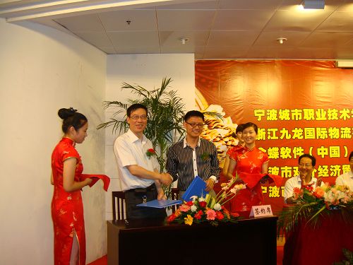 为加强内涵建设,深化校企合作,积极拓展职业教育工学结合新模式,商务学院于6月30日在艺术楼报告厅举行了校企合作项目签约授牌仪式。学院院长李太武教授,校工会主席、商务学院党总支书记季锦旗,党/校办主任、宣传部部长俞立军,商务学院执行院长沈时仁及浙江九龙物流有限公司、金蝶软件宁波分公司、宁波对外经济贸易培训中心、宁波每食屋工贸有限公司等四家企事业单位领导、校院二级有关部门负责人出席了签约授牌仪式。学院党委委员、院长助理潘菊素主持了签约授牌仪式。