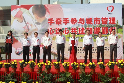 学校副校级巡视员、工会主席季锦旗,鄞州城管局李耀副局长、谢跃伟副局长、鄞州团区委洪峰书记,首南街道办事处张民副主任,中河街道印孟飞副主任等领导出席了此次启动仪式。我院100余名城事志愿者以及鄞州城管局团委、首南中队、中河中队、万里学院、宁波理工学院、医药高等专科学院和来自社会各界的代表等300余人参加了启动仪式。启动仪式由校团委书记林辉主持。