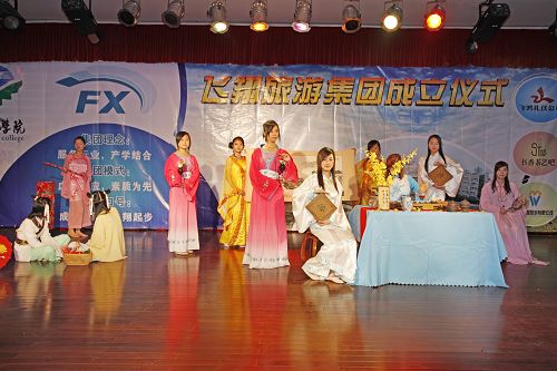 成立仪式上,旅游学院执行院长章平全面介绍了旅游学院职业素质养成工程的实施特色和培养目标,校党委书记李维维致了辞,院长李太武和“飞翔旅游集团”董事长章平共同为“飞翔旅游集团”揭牌,颜炼钢、潘菊素、钱理文为三个子公司授牌。“宁波吾爱旅游有限公司”、“书香茶艺吧”、“飞鸿礼仪公司”等三个子公司分别进行了公司形象展示。