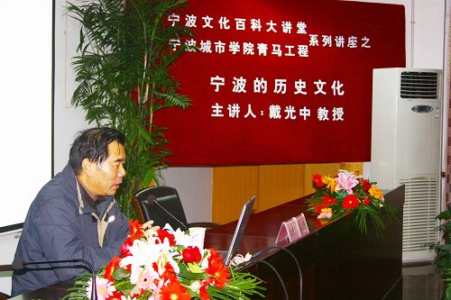 戴光中教授主要从宁波在独特的港口条件和优越的地理位置的先天优势下所滋生的丰厚的历史文化遗产,奠定了良好的人文环境;“老百姓”的勤劳智慧,不断推动宁波经济社会向前发展,创造了宁波灿烂的文明历史。戴教授分别从“河姆渡人”、“千年港城”、“浙东学术”这三方面阐述了宁波的悠远历史。戴教授还对宁波的旅游形象口号“港通天下、书藏古今——宁波旅游欢迎你”、“走遍天下,还是宁波江厦”、“看上海世博,游阿拉宁波”展开,阐述了宁波历史文化。