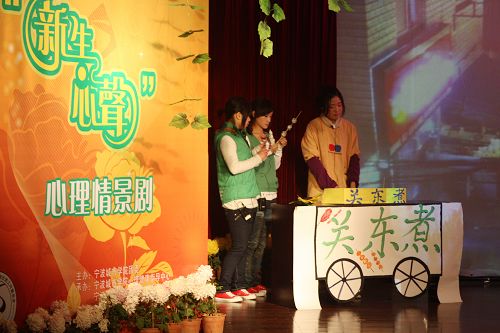 12月14日,第五届新生艺术节之第二届“新生·心声”心理情景剧大赛在艺术楼演艺大厅举行。来自7个学院的7支表演队和校“青阳”艺术团的话剧队从初赛中脱颖而出,参加了最终的角逐。