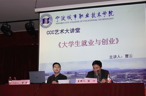 4月27日晚艺术学院在演艺大厅举办了“大学生就业与创业”的主题讲座。讲座邀请了宁波市甬商发展研究会秘书长,市职业经理人协会秘书长,市公共关系协会副秘书长,市中南经济文化咨询中心主任,《甬商》杂志主编曹云主讲。艺术学院执行院长潘沁主持讲座。