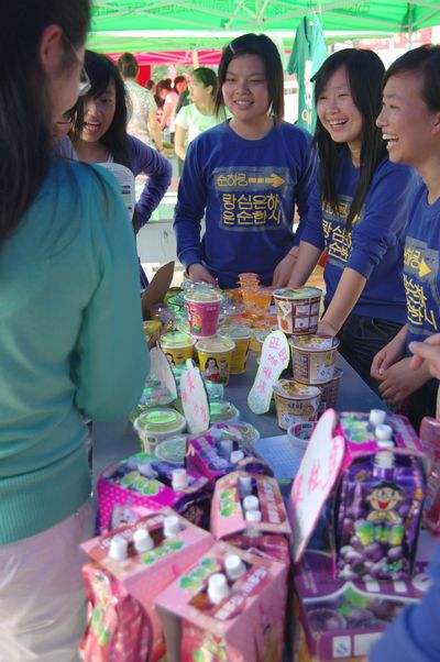 昨天下午,星空官方入口“营销一条街”开张,34家学生店铺挂牌营业,活动将持续7天,有学生私营、校外代理和校外合作3种经营方式。图为“冻人心弦”商铺学生吆喝卖果冻。