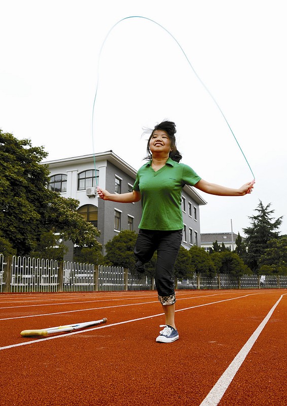 还是上个月,校园宣传栏里贴出了一份在奉化市举办的 “青春达人秀”比赛告示,室友不约而同地想到了赵芳,鼓励她踊跃参赛。海选中,赵芳凭着单腿“高速”跳绳表演从500多人中脱颖而出,并以一组“花样跳绳大杂烩”晋级决赛,最终夺得了达人秀比赛的“金盾杯”青春活力奖。