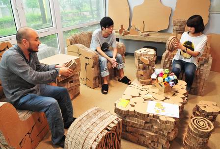 图为创意导师向学生展示用纸板做成的家具。王增芳 傅祖栋 摄