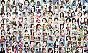 这是一幅用了4084张笑脸,根据照片的光影、暗淡,组成的宁波地标三江图。