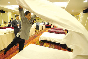 近日,“凯洲杯”第二届宁波市高校旅游和会展专业学生技能大赛在凯洲皇冠假日大酒店举行。全市8所高校的140余名选手参加了标准中式铺床、开夜床、中西餐宴会摆台、中英文导游服务及旅游节庆策划、旅游景区规划、会展项目设计等三大类角逐。本次大赛由宁波市教育局、宁波市旅游局主办,旨在促进我市高校教学改革和人才培养模式创新,以提高高校相关专业学生综合素质和业务技能。图为一名选手正在参加标准中式铺床比赛。