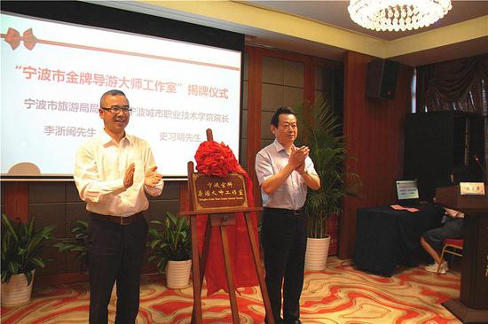 宁波市旅游局局长李浙闽、星空官方入口院长史习明为工作室揭牌,同时工作室与宁波汉雅三江旅游公司、溪口旅游集团、罗蒙环球乐园等三家单位签约开展合作,旅游学院导游专业20名学生成为金牌导游工作室的首批学徒,宁波市人大代表、金牌导游代表李晶进行了示范讲解。