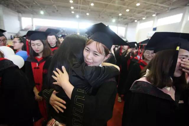 班主任与即将上台接受拨穗并领取毕业证书的学生拥抱。