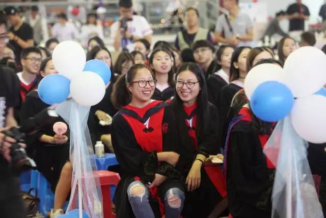 毕业典礼现场布置了许多气球,有着婚礼现场的氛围。