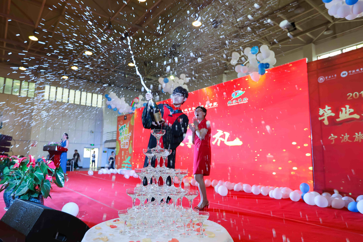 在这场毕业典礼上,旅游管理专业的景观景区小品设计、酒店管理的茶艺和调酒表演、会展策划与管理专业的婚庆策划等专业技能都得以融入,为这场毕业典礼注入了专业的特质。