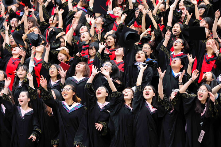 331名毕业生分别在各自班主任的带领下,缓缓走过红地毯。在婚礼上,新人走向拱门前往舞台是嫁给幸福,而此次毕业典礼上毕业生走向舞台则是对毕业后拥有美好前程的期许。在班主任看来,他们对学生的交托就好像是对自己儿女终生幸福的托付。