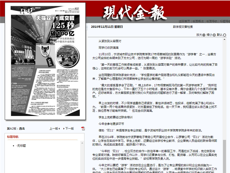 今年该校的“双11”教学实践活动由教务处和团委牵头,早在五六月份就接到了宁波多家企业的预约,10月份开始岗前培训,参加范围进一步扩展至全校层面,有超过1200名学生参加百草味食品、马骑顿童装、宏才网络、电商生产性实训基地等项目的“双11”活动开展岗位实践,并持续至本月18日。