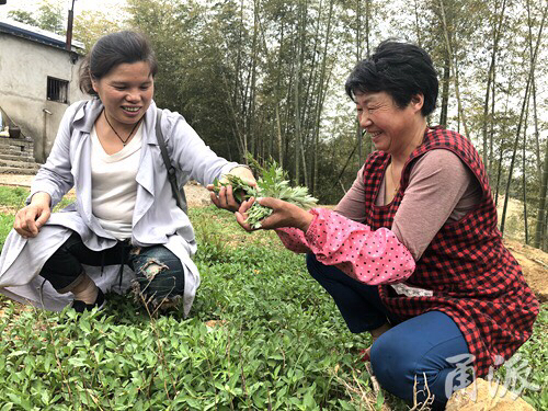 (舒巧云(左)正在余姚鹿亭“野菜谷”指导农户。)