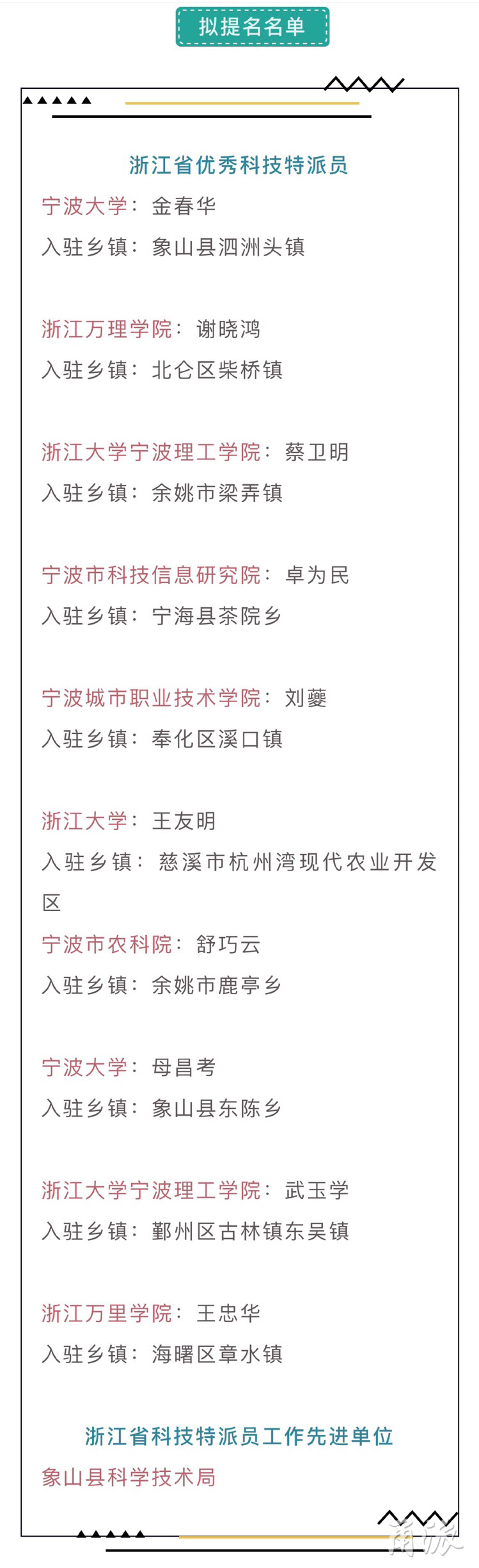 记者刚刚从市科技局获悉,宁波市拟推荐的省优秀科技特派员和科技特派员工作先进单位名单已公示,共有10名田野“智多星”和一家先进单位入围。在结束公示后,这些人选和单位将代表宁波,与浙江省内各优秀科技特派员角逐“省奖”。